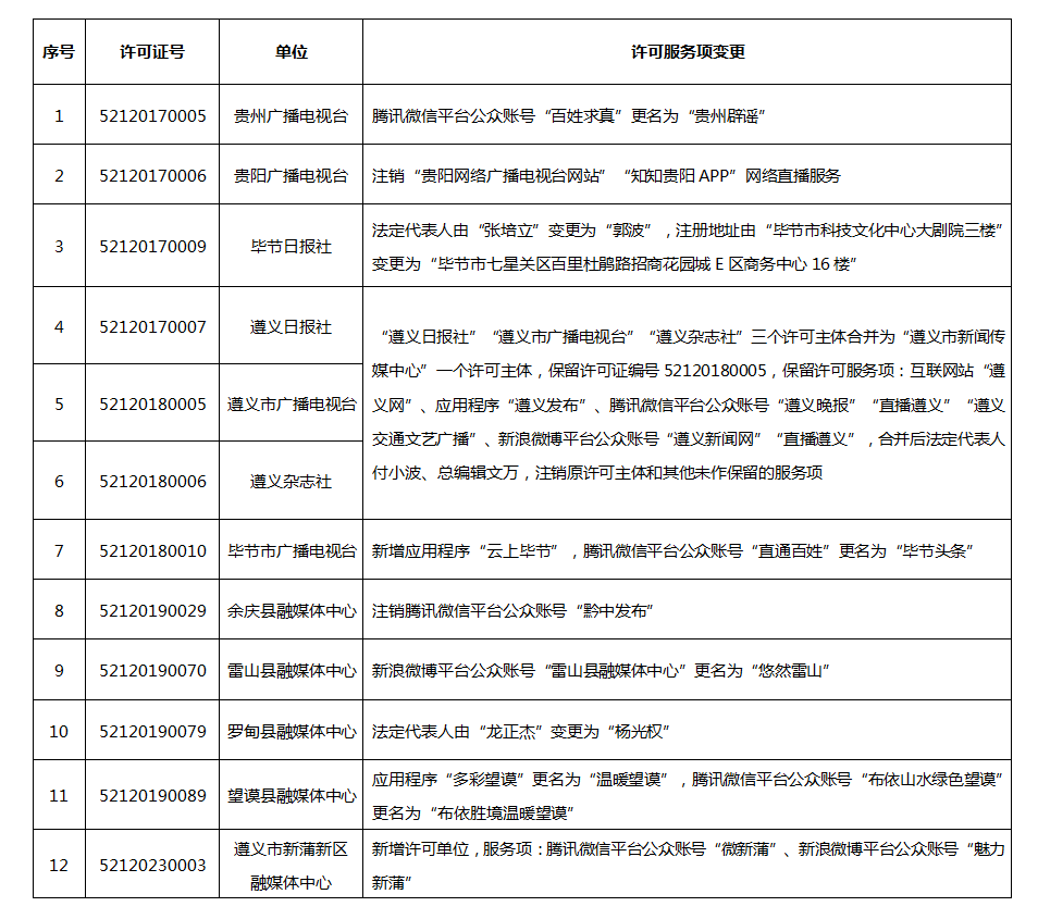 2023年11月,贵州省互联网信息办公室依法对相关单位提交的许可服务项变更申请开展审批,同意有关许可服务项变更事宜,现公示如下: