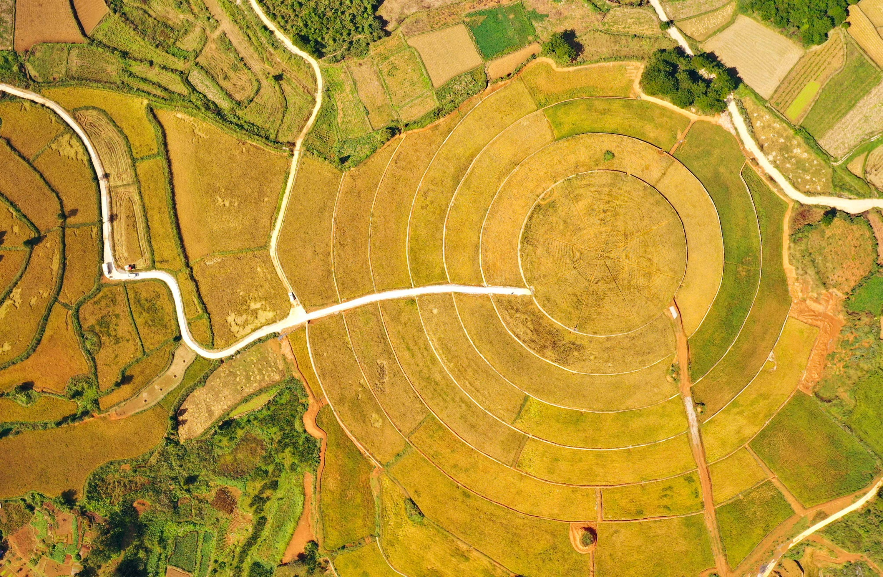 用无机向下俯视,下面是一片金黄,最上面是一丘有十多亩地圆圈大田,周围的七丘大田组成的七个大圆环,呈梯田状,收割机在环形里来回忙碌,构成了一幅美丽的秋日美景图,十分壮观。