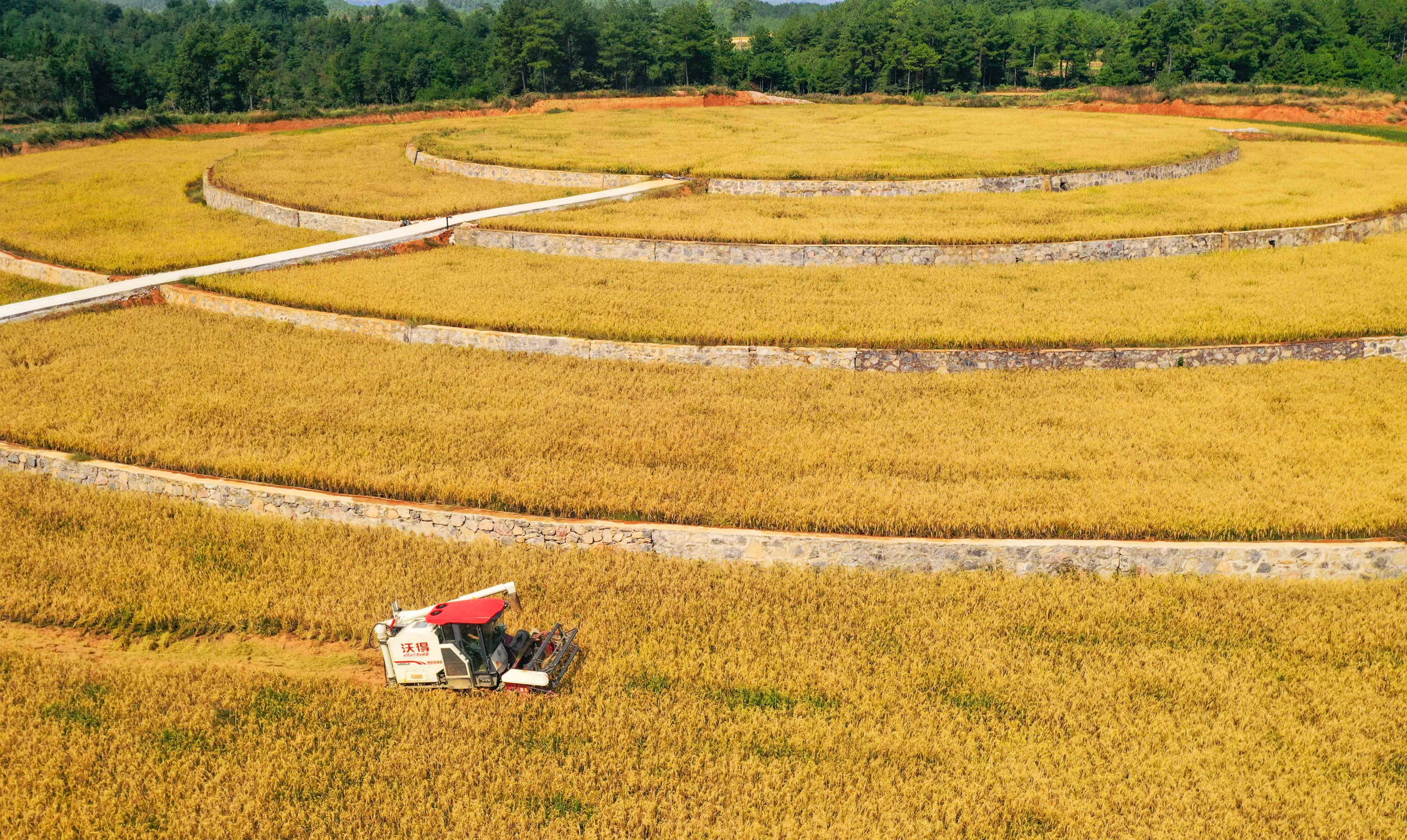 “明天,我们将增加收割机,打算在一周内将水稻抢收完成,紧接着马上翻耕,播种油菜种子。”滕云伍说,高标农田项目以 ‘稻-油’轮作的方式发展水稻和油菜,利用梯田的农作物景观,打造美丽乡村,实现农旅一体化。