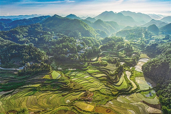 6月16日,贵州省黔西市金兰镇宝石村,绿色的梯田、民居与青山相映成景。
