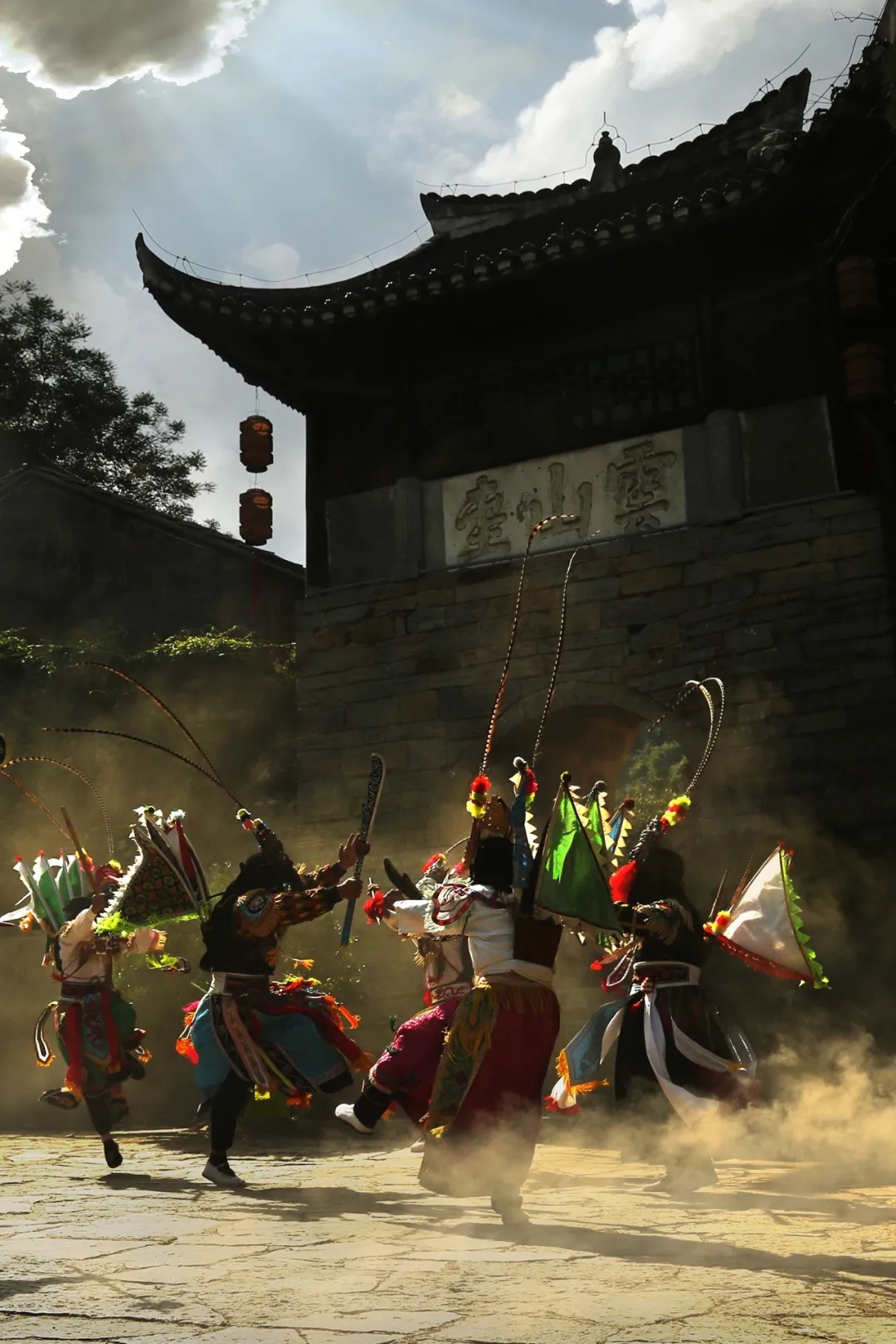 屯堡妇女的传统服饰是“凤阳汉装”,那是沿袭明代江淮女子典型打扮的遗风;而在演武堂,男子们挥戈起舞。最具代表性的屯堡“地戏”奏响远古战歌,堪称“行走的史诗”,粗狂而震撼。