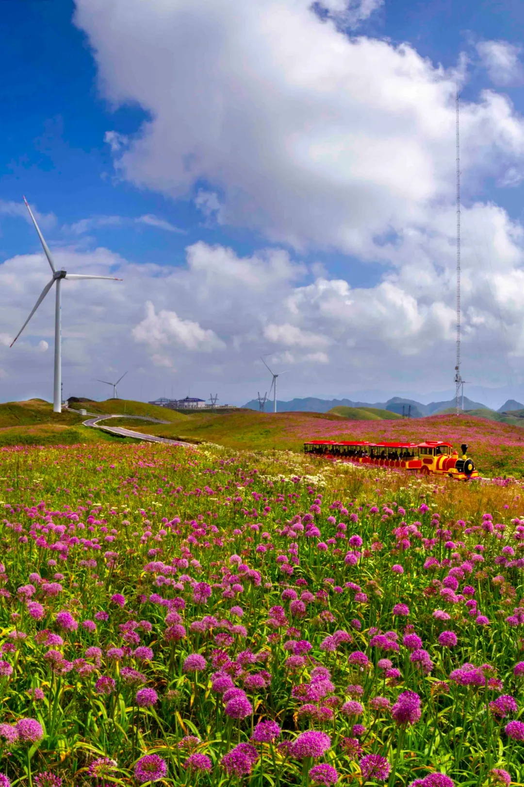 承载游客的小火车穿梭在紫色的韭菜坪。