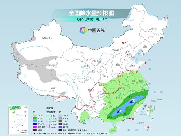 后天起,西南大部降水按下“暂停键”,中东部降水将明显增多。预计,新疆南部山区、西藏北部、青海西部、黄淮南部等地部分地区有小到中雪或雨夹雪。湖南南部、江西大部、福建西部和北部、浙江中南部、华南中北部等地部分地区有中到大雨,局地有暴雨(50~60毫米)。