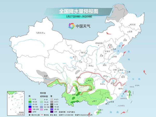 中央气象台预计,今天,内蒙古东北部、黑龙江西北部、西藏东部、川西高原、贵州中西部、云南东北部等地部分地区有小雪或雨夹雪,贵州西部局地有冻雨。重庆南部、贵州东部、云南大部、湖南南部、华南中西部等地部分地区有小到中雨。