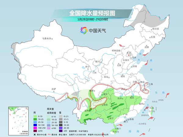 明天,内蒙古东北部、黑龙江中西部、新疆南疆西部山区、西藏东南部、川西高原南部、贵州西北部等地部分地区有小到中雪或雨夹雪。江南中西部、贵州大部、云南大部、华南大部等地部分地区有小到中雨。