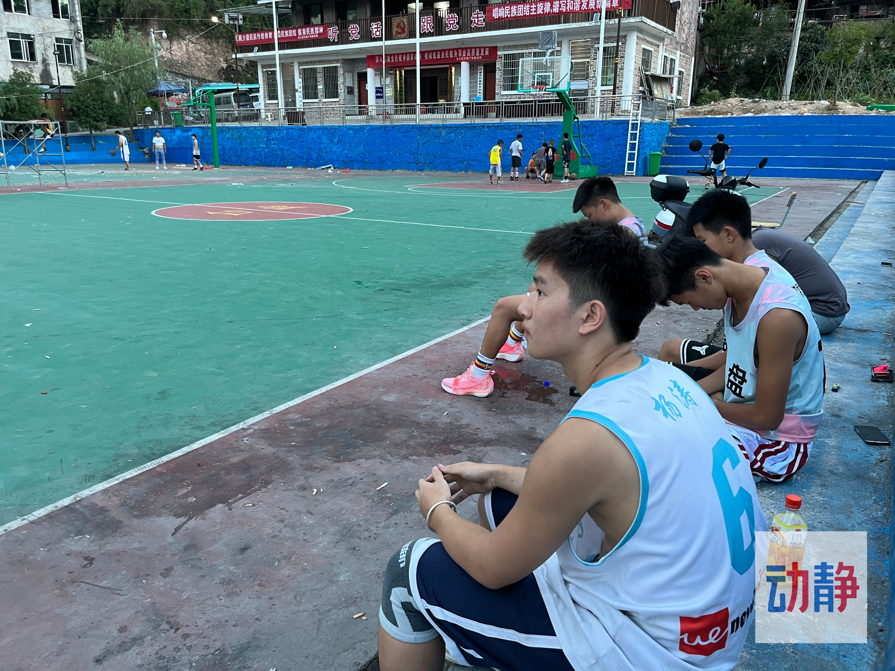 台盘村的“网红球场”由两个标准篮球场组成,一面临街,一面挨着村综治中心,另外两面则建有梯级看台。看台最高有21级台阶,顶上搭有一排临时遮阳棚,也是赛事期间的餐饮区。比赛已经结束,棚内只剩三五家小摊。在现场,赛事组织者和队员们在里面接受各家媒体的采访。“问的问题都差不多,重复说了很多遍。”熬夜打比赛,又面对媒体记者的轮番“轰炸”,队员们满脸疲惫。