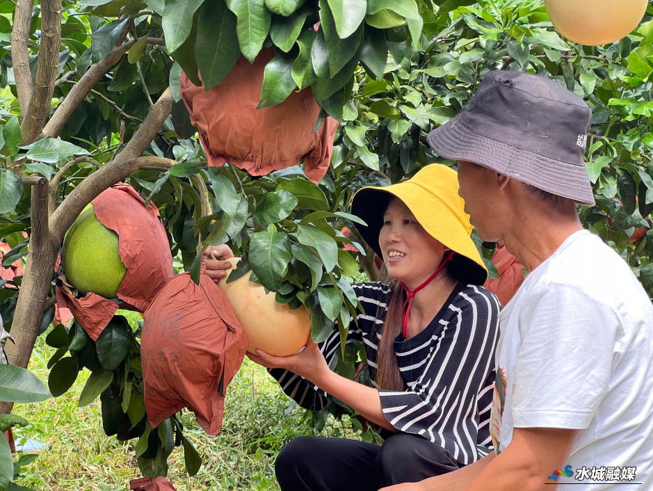 走进都格镇龙井社区王家寨组的红心柚基地,连片的柚子树整齐排列,套着袋子的柚子压弯了树梢。剥开纸袋,一个个硕大饱满、色泽金黄的红心柚在阳光下格外诱人,吸引了不少游客打卡拍照、进园采摘。