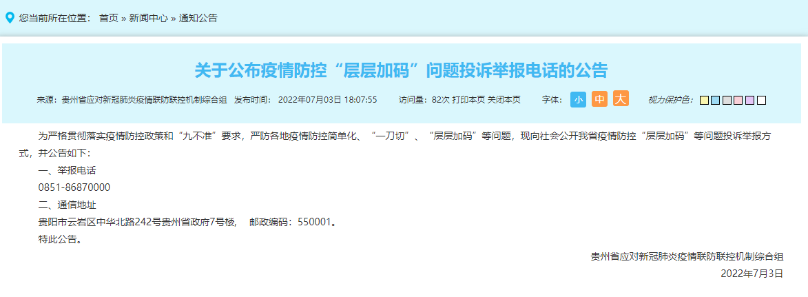 为严格贯彻落实疫情防控政策和“九不准”要求,严防各地疫情防控简单化、“一刀切”、“层层加码”等问题,现向社会公开我省疫情防控“层层加码”等问题投诉举报方式,并公告如下: