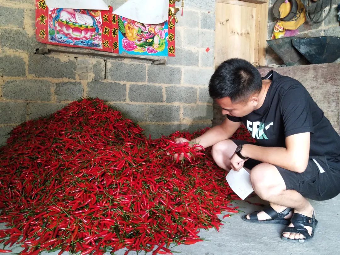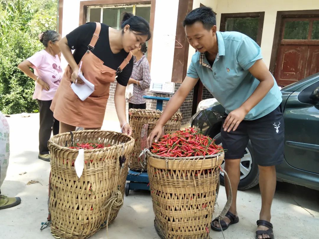 同样因为辣椒产业感到开心的,还有瑞溪镇木盆寺村的辣椒种植大户蔡超,记者见到他时,他正在对工人们采摘的辣椒进行过秤收购。看着一框框红彤彤的辣椒,蔡超露出了满意的笑容。