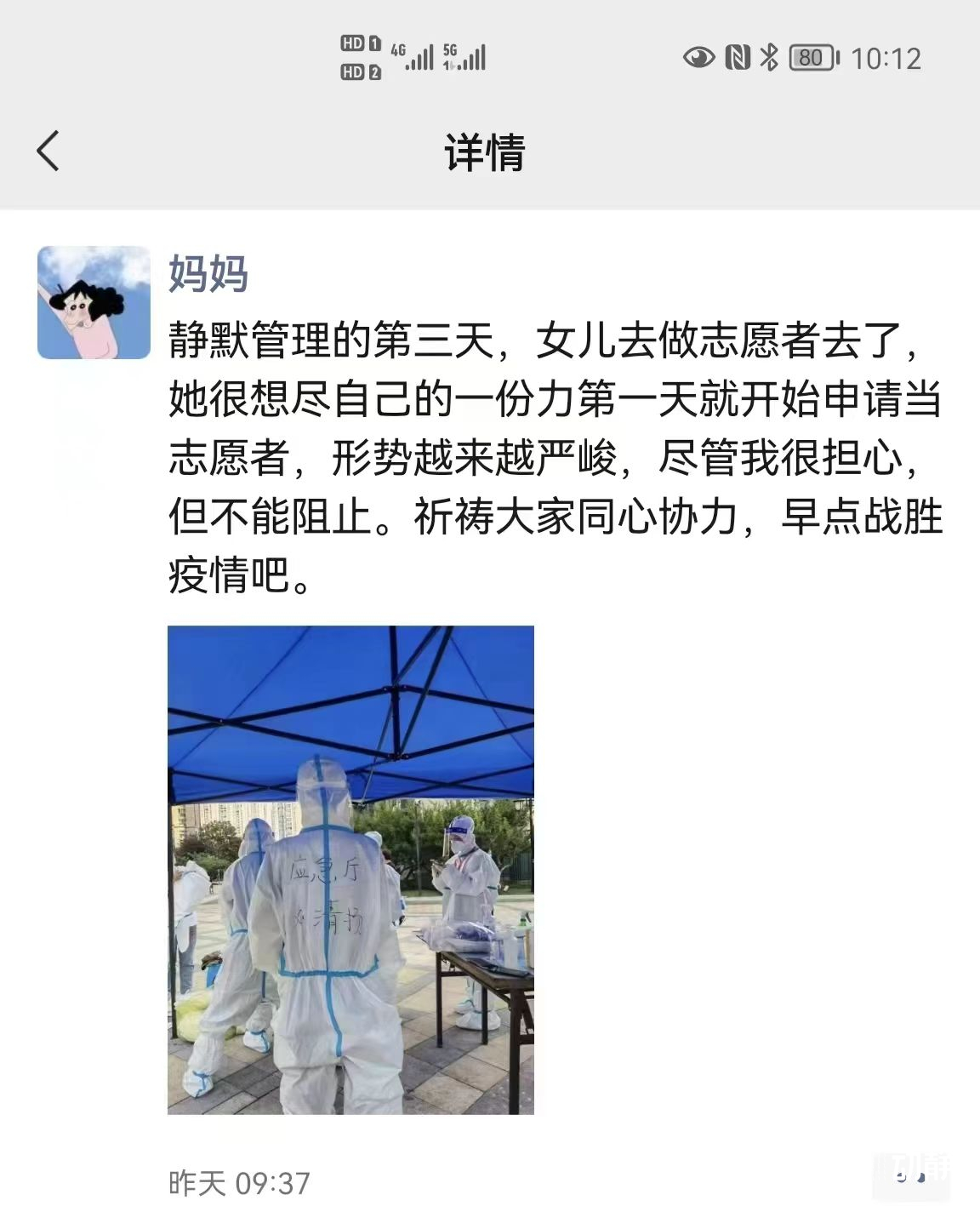 “静默管理的第三天,女儿去做志愿者了,形势越来越严峻,尽管我很担心,但不能阻止。祈祷大家同心协力,早点战胜疫情吧”。这是小李做志愿者第一天,李妈妈发的一条微信朋友圈,为了不让女儿看到,她屏蔽了小李。小李还是在亲戚的截图中,看到妈妈的这段话。