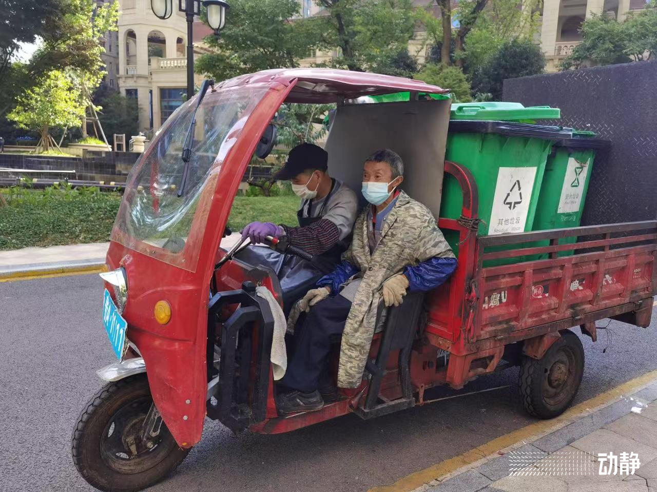 老杨开的车是小区清运垃圾的三轮车。原本开三轮车清运垃圾的工人因为疫情,无法出门,老杨就自告奋勇顶替上了这份工作。老杨说,“现在待在家的业主比平时多,产生的垃圾量就比较大,每天的生活垃圾比往常要多一倍”。