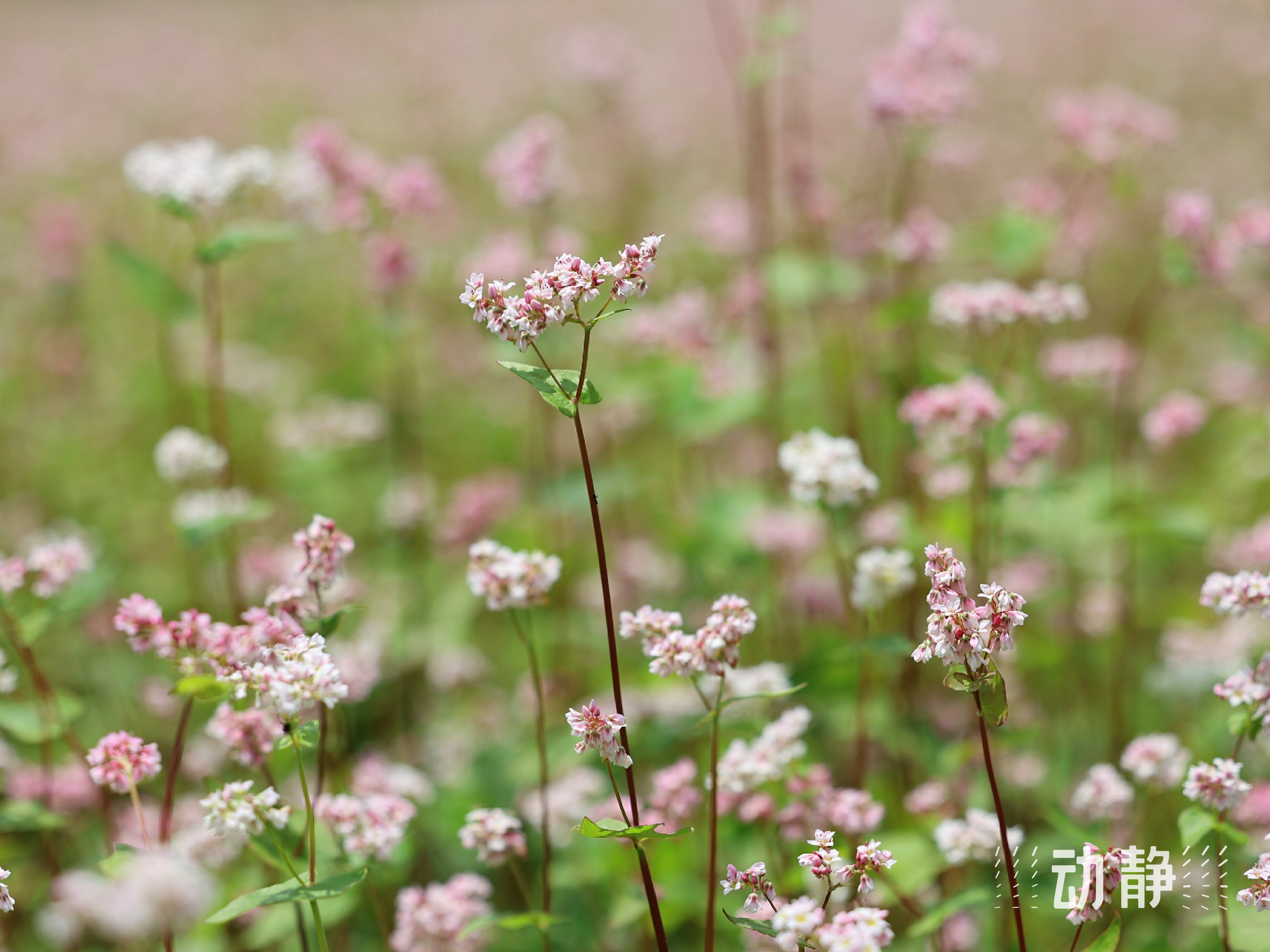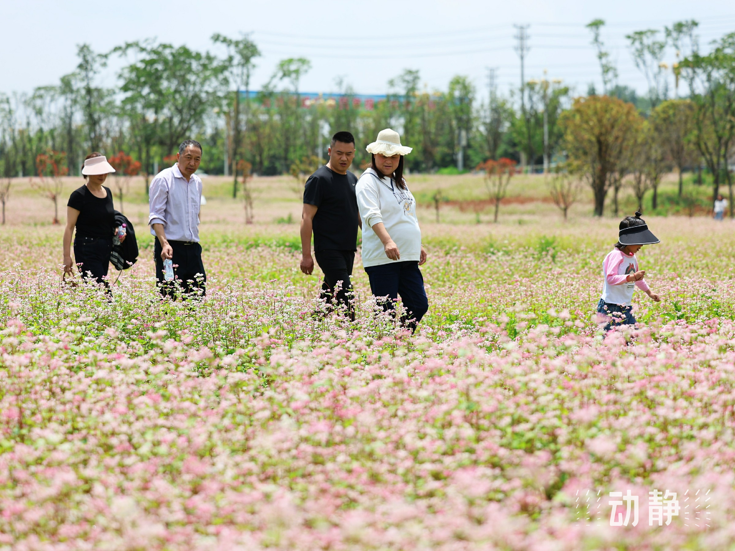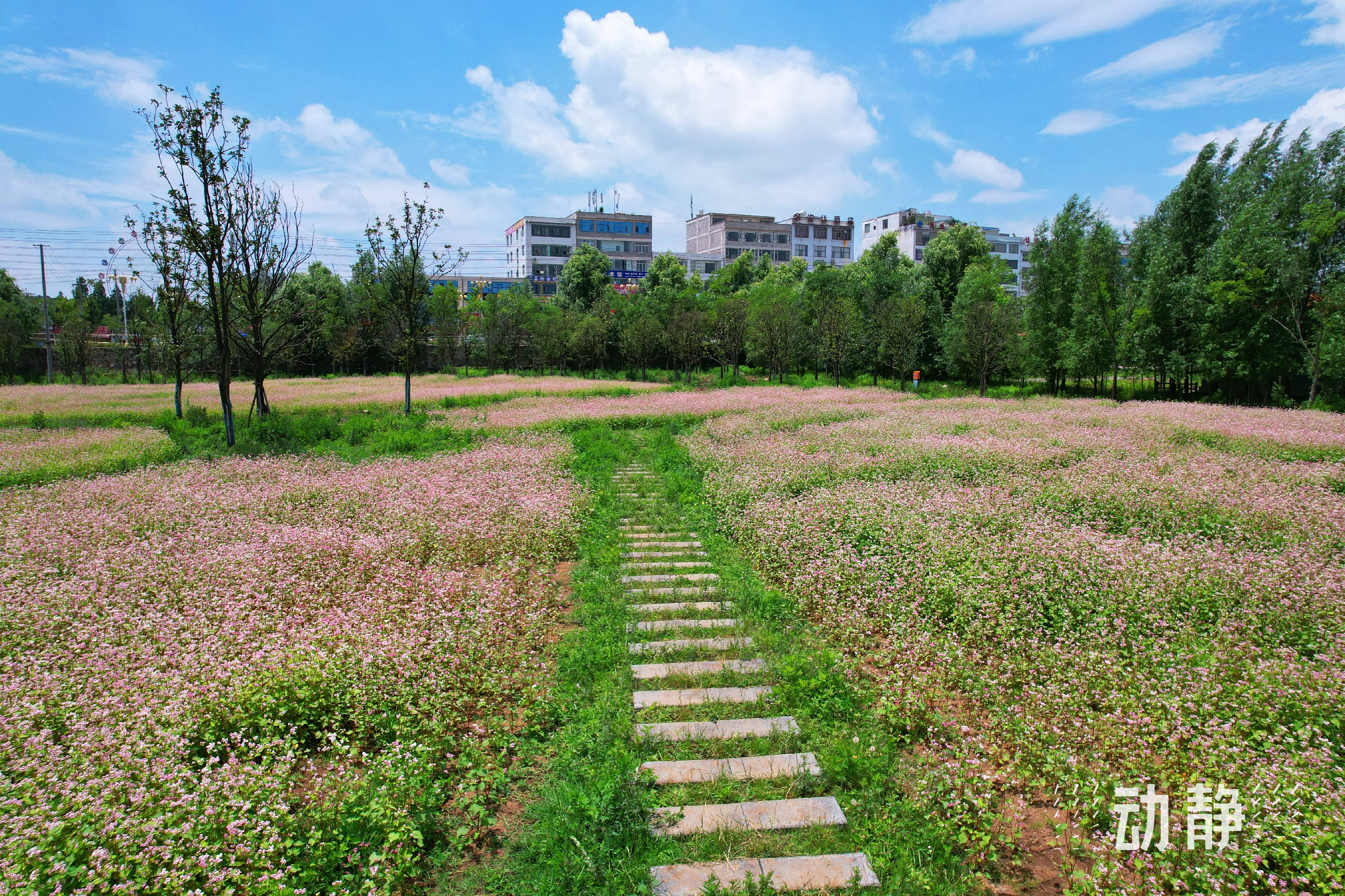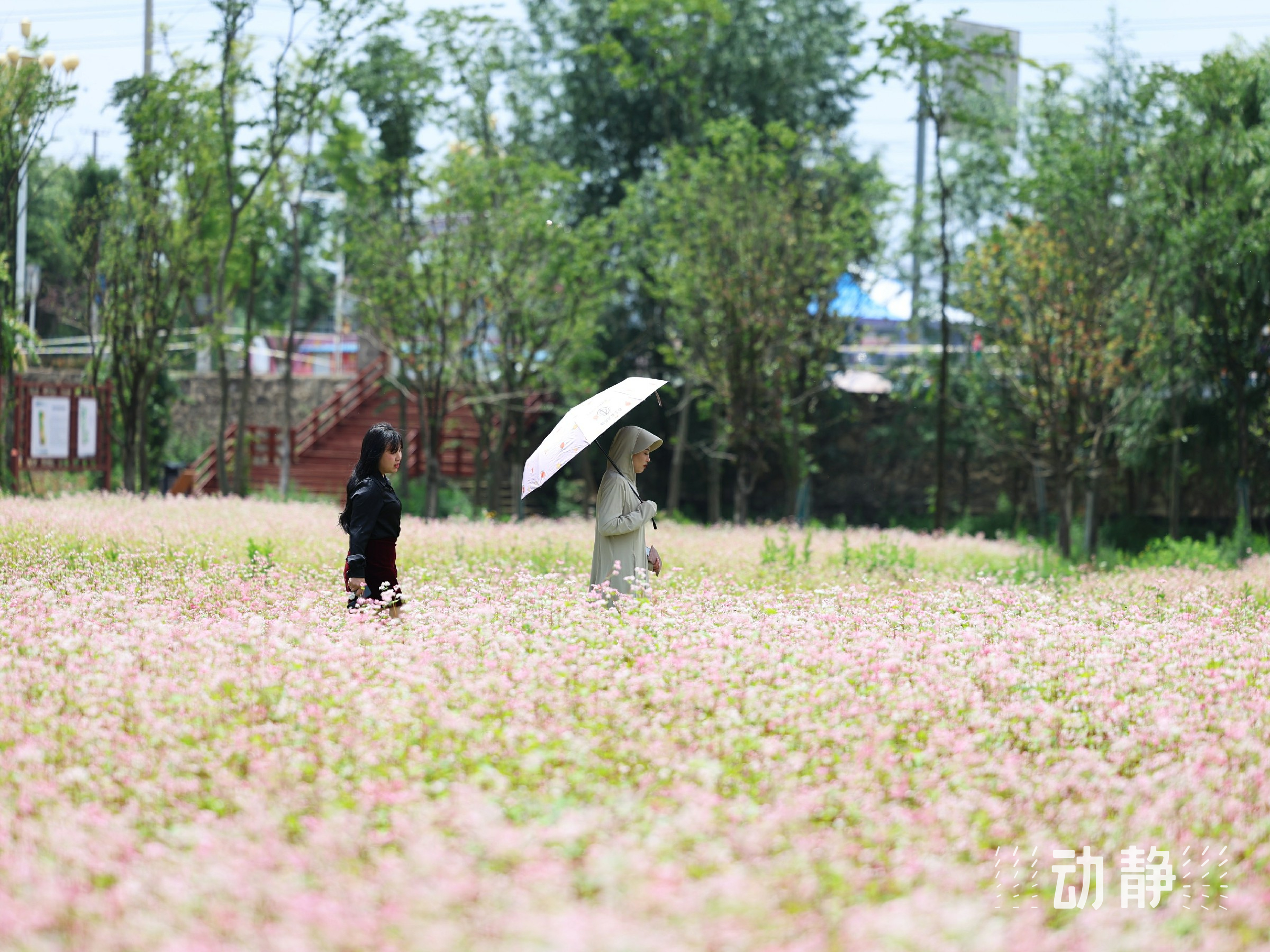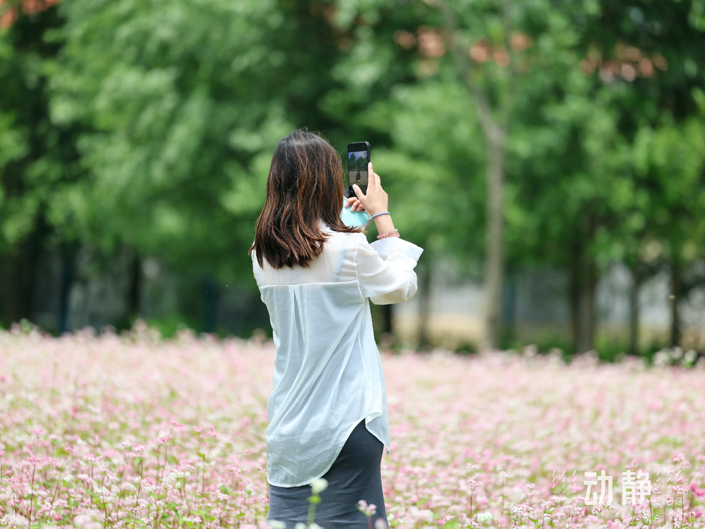 6月16日,贵州省毕节市威宁自治县锁黄仓湿地公园内,荞花盛开,吸引游客前来打卡拍照。