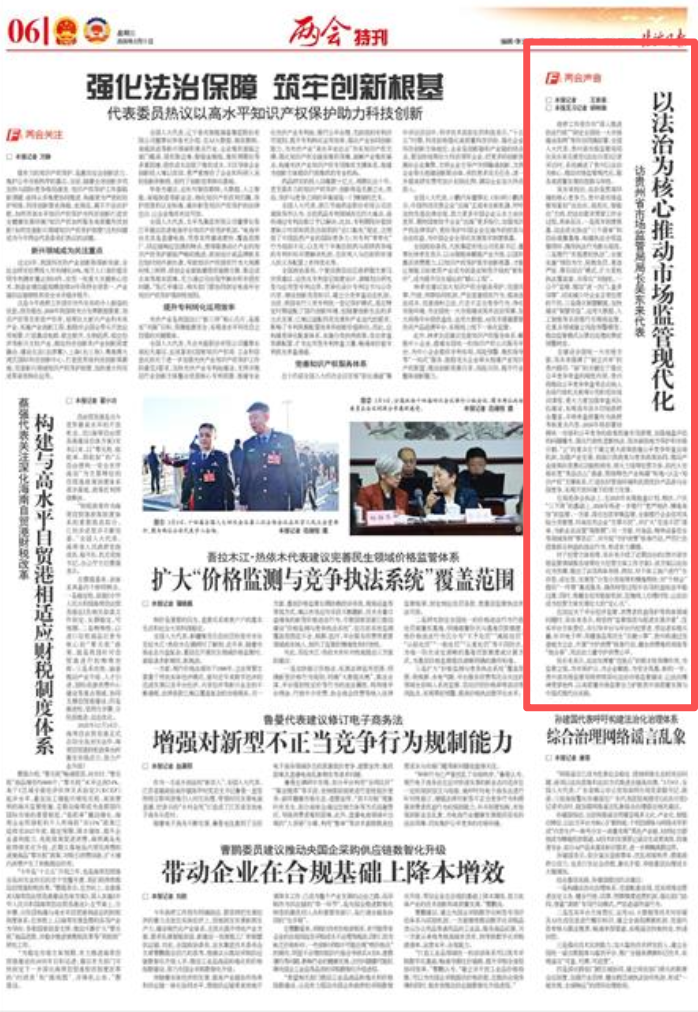 政府工作报告对“深入推进依法行政”“制定全国统一大市场建设条例”等作出明确部署。全国人大代表、贵州省市场监管局局长吴东来在接受《法治日报》记者采访时,系统阐述了贵州以法治为核心,推动市场监管现代化,服务高质量发展的思路与举措。