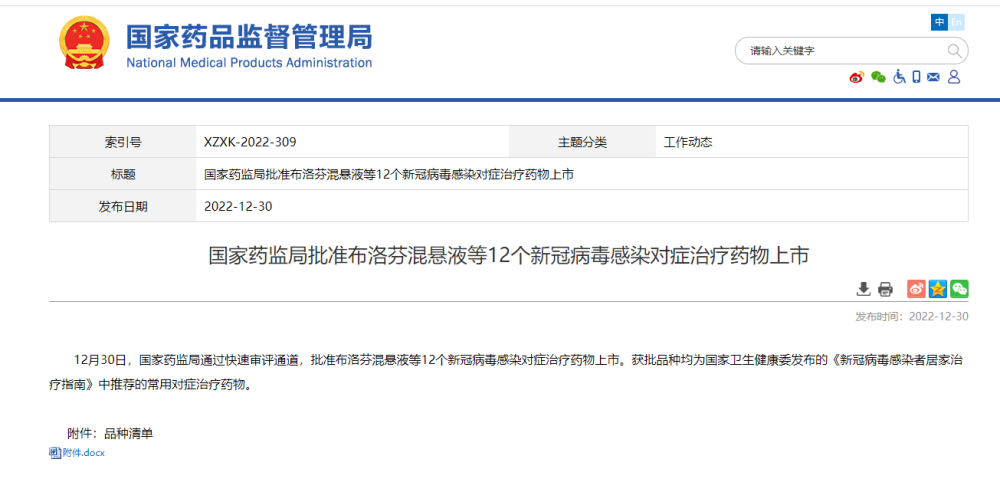12月30日,国家药监局通过快速审评通道,批准布洛芬混悬液等12个新冠病毒感染对症治疗药物上市。获批品种均为国家卫生健康委发布的《新冠病毒感染者居家治疗指南》中推荐的常用对症治疗药物。