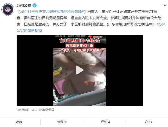5月11日,河南郑州。梁女士无意从监控中发现自家8个月宝宝被育儿嫂剧烈摇晃哄睡,翻看此前监控也有类似行为,其狡辩称这是“摇篮式哄睡”。梁女士称,这位阿姨是金牌月嫂,事发后已让阿姨离开并带宝宝CT检查,虽然医生说目前无明显异常,但宝宝内脏未发育完全,长期性摇晃对身体健康有极大危害,已经算是虐待的一种方式了,小区解封后将会报警。该板块负责人赵女士称,该月嫂在客户投诉第一天已被系统拉黑,并不是梁女士说的金牌月嫂,只是普通育儿嫂。
