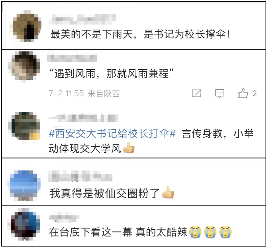 7月2日,西安交大研究生毕业典礼现场,校长王树国致辞时突降大雨,校党委书记卢建军撑起雨伞走到王校长身后,在场师生欢呼致敬,这一幕令无数网友感动。有网友称,这是给毕业生们上的最好一课。记者注意到,于7月1日举行的本科生毕业典礼上,王树国校长曾脱稿演讲16分钟。