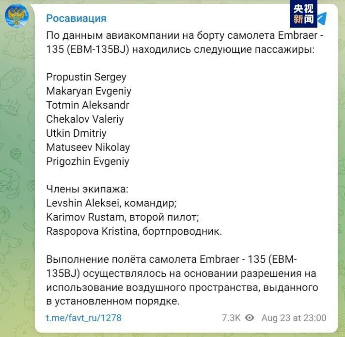 当天,俄罗斯联邦航空运输署发布失事飞机人员名单,确认俄罗斯私营军事承包商瓦格纳集团创始人普里戈任和瓦格纳创始人之一、指挥官乌特金在失事飞机上。人员名单显示,7名乘客中包括瓦格纳集团的几乎所有高层领导。
