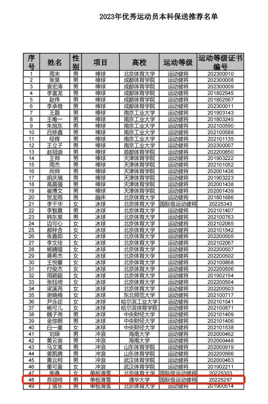 名单显示,单板滑雪运动员苏翊鸣保送推荐清华大学。