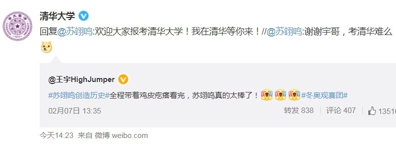2022年,在北京冬奥会获得一金一银的苏翊鸣回复大家对他的祝福时,问曾在清华读书的田径运动员王宇:“考清华难吗?”随后,清华大学在官博发声:“@苏翊鸣,欢迎大家报考,我在清华等你来!”