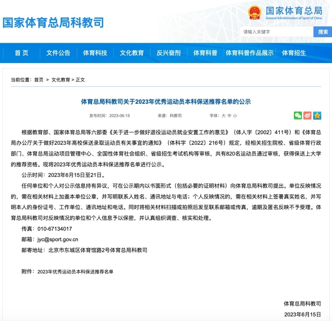 6月15日,国家体育总局科教司发布关于2023年优秀运动员本科保送推荐名单的公示,公示时间为2023年6月15日至21日。