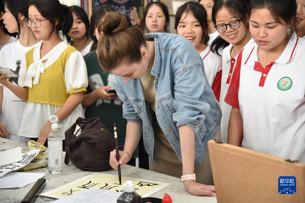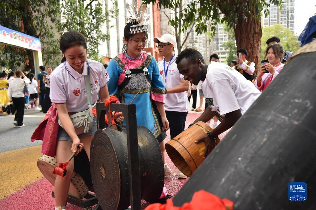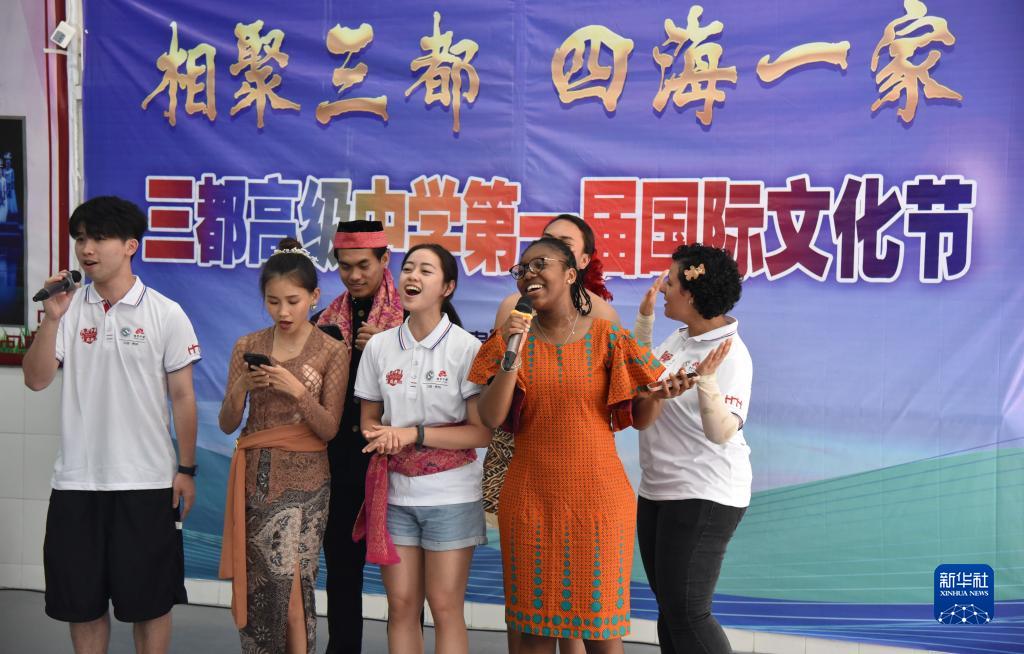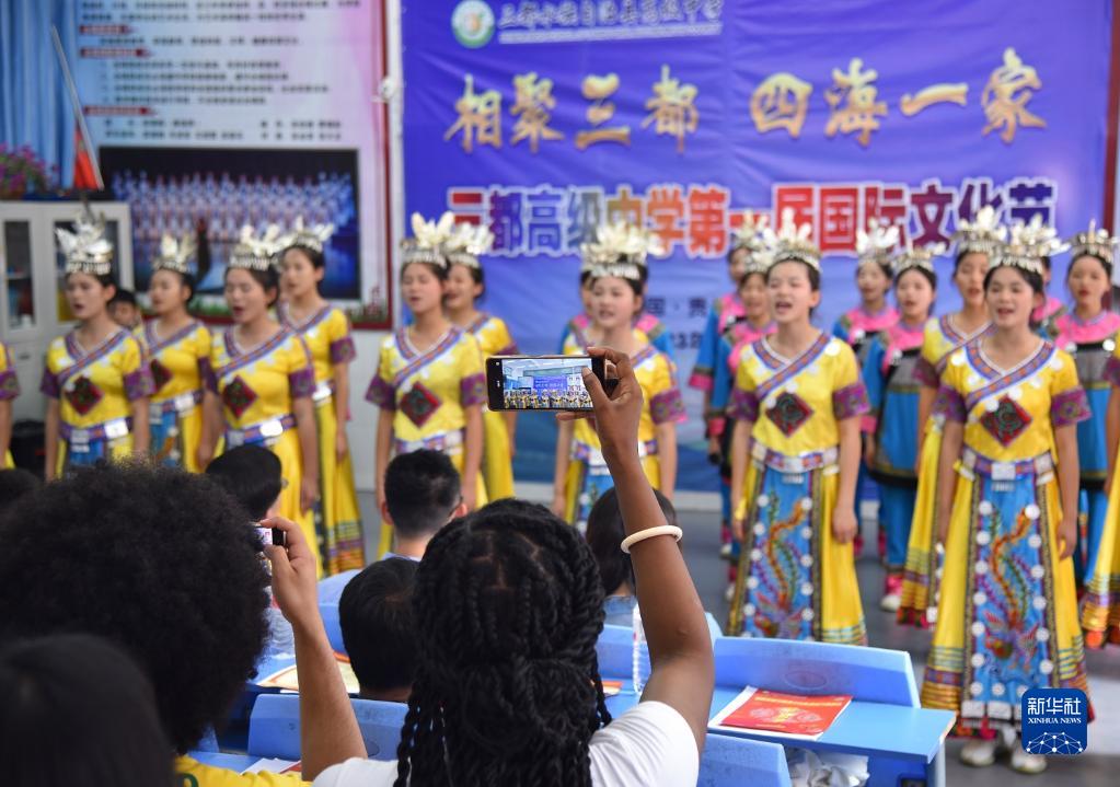 近日,“邂逅中国”来华留学生社会实践活动在贵州举行。6月5日,来自突尼斯、巴基斯坦、老挝、巴西、印度尼西亚等国家的20名来华留学生来到贵州省黔南布依族苗族自治州三都水族自治县的三都高级中学,和学生们一起参加该校举行的第一届国际文化节。