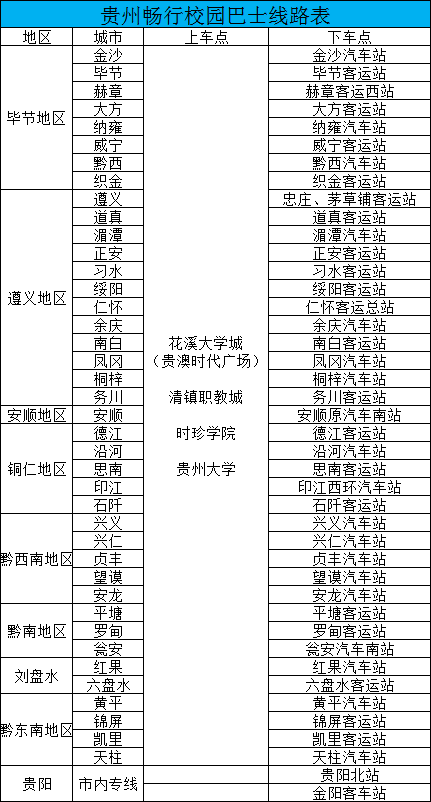 “五一”假期马上就要到了,为保障花溪大学城、贵州大学、清镇职教城等贵阳市范围内二十多所高校的师生“五一”期间平安出行,贵州畅行校园巴士开通40多条直达省内各个地州县(市)直通车路线,同时上线部分学校直达贵阳北站、金阳客车站、火车站等枢纽站点线路,方便师生出行。