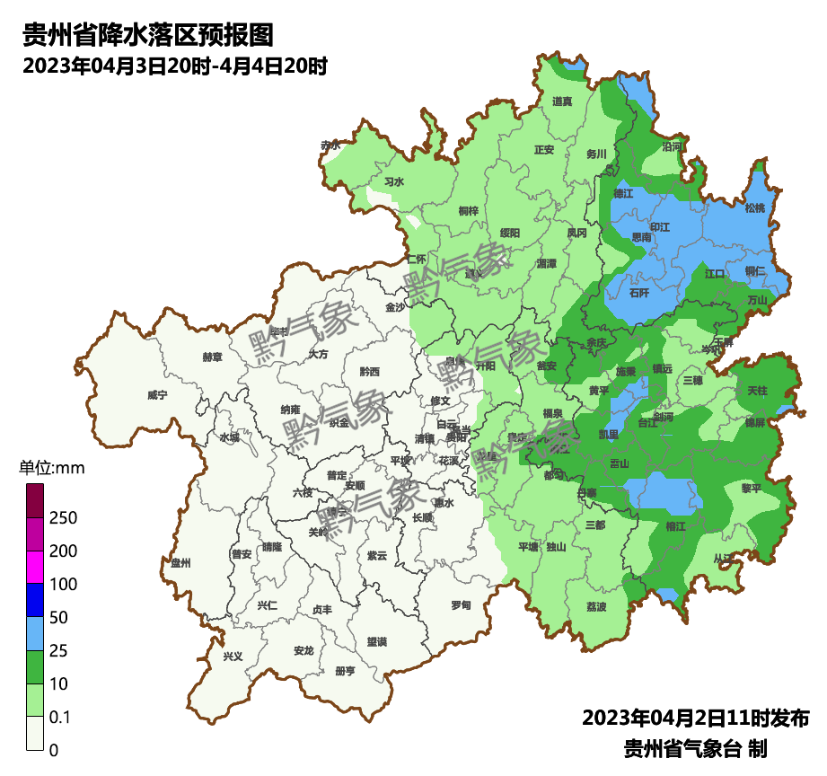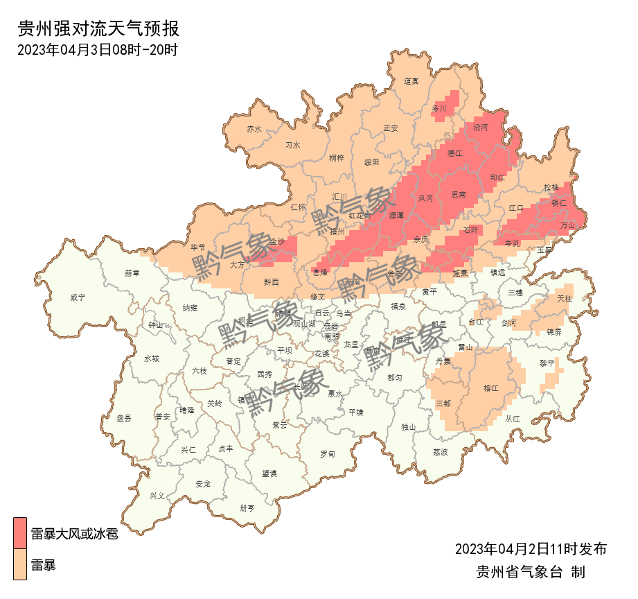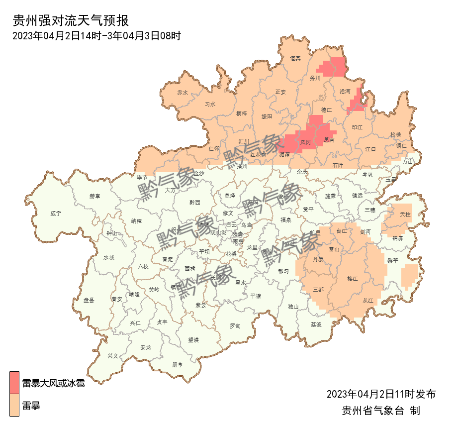 贵州省气象台4月2日下午2时发布雷雨冰雹大风预报,预计今天(2日)午后到明天夜间,贵州省中东部地区将出现强对流天气。明天(3日)午后到夜间,贵州省的西部地区多云,其余地区阴天到多云有阵雨或雷雨,中东部局地有中到大雨,并伴有冰雹、雷暴大风及短时强降水等强对流天气。