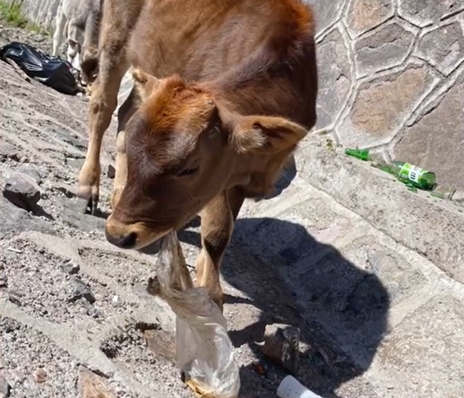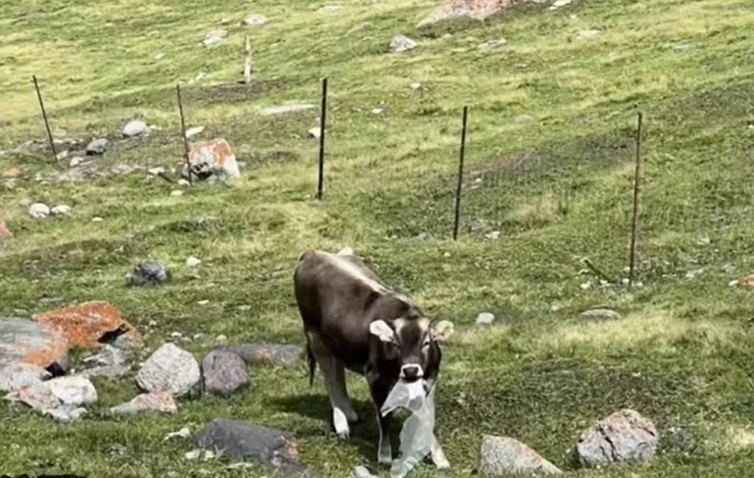 有网友注意到,当地一些牛羊等动物,会因在吃草时误食或感到好奇而啃嚼塑料袋等垃圾。