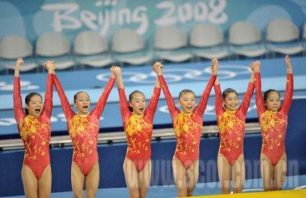 ▲2008年8月13日,中国女子体操队队员程菲、杨伊琳、江钰源、何可欣、李珊珊、邓琳琳等人,在北京奥运会女子体操团体决赛,为中国夺取了中国女子体操史上首枚团体奥运金牌。