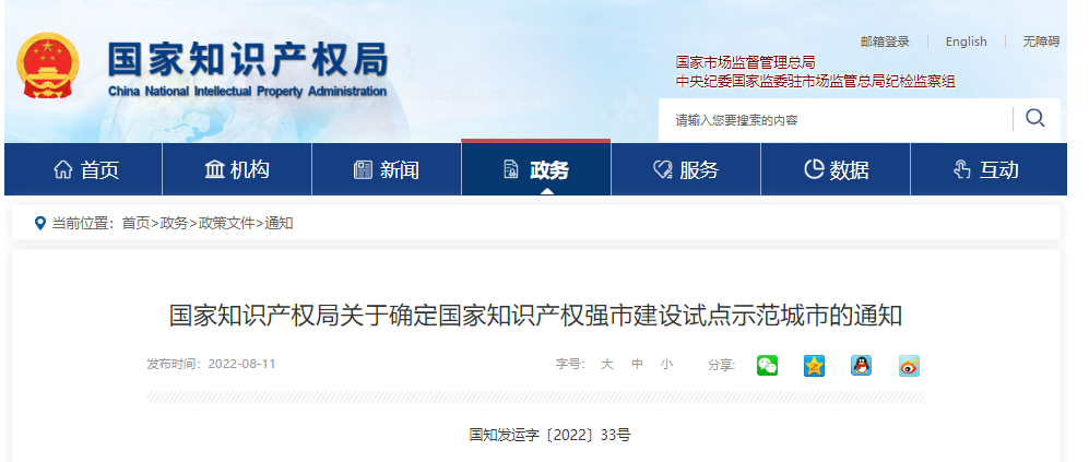▲国家知识产权局网站日前发布通知,确定国家知识产权强市建设试点示范城市,打造区域知识产权工作高地,引领带动全省知识产权高质量发展。其中,贵州省贵阳市、遵义市入选。试点示范时限自2022年7月至2025年6月。