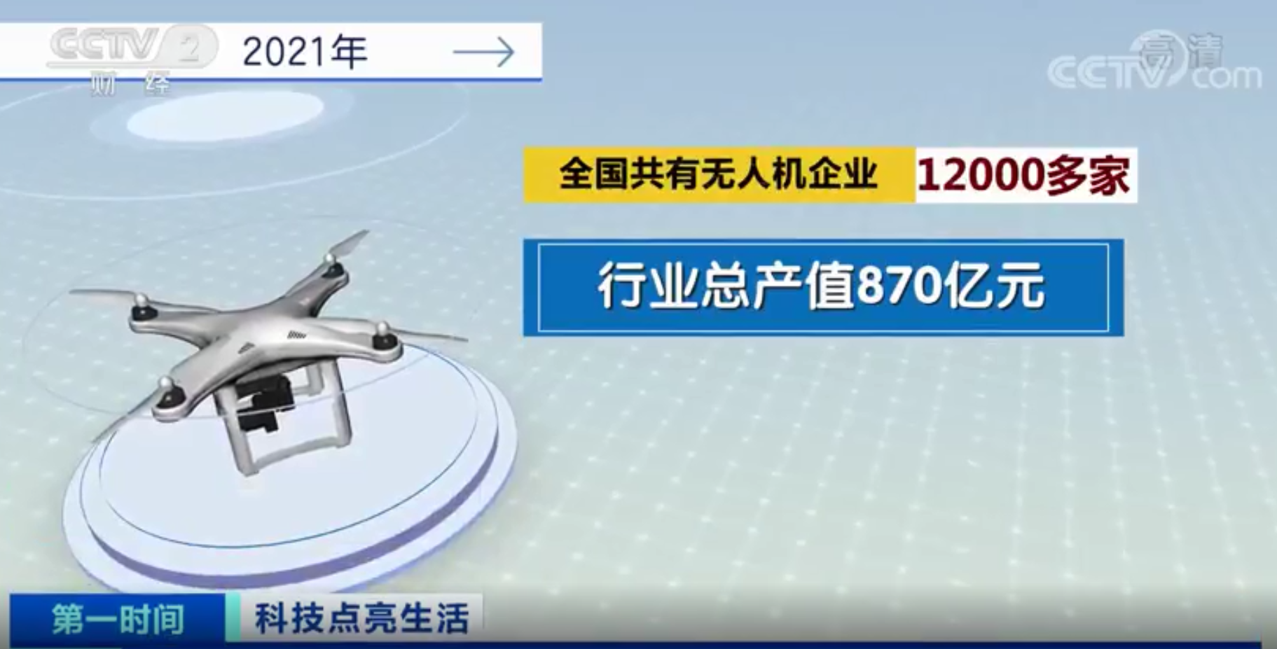 ▲2021年,全国共有12000多家无人机企业,行业总产值达到870亿元。广东省深圳市无人机行业协会会长介绍:“工业级无人机方面,中国占全球55%的市场,消费类无人机方面,中国在世界占比达74% 。