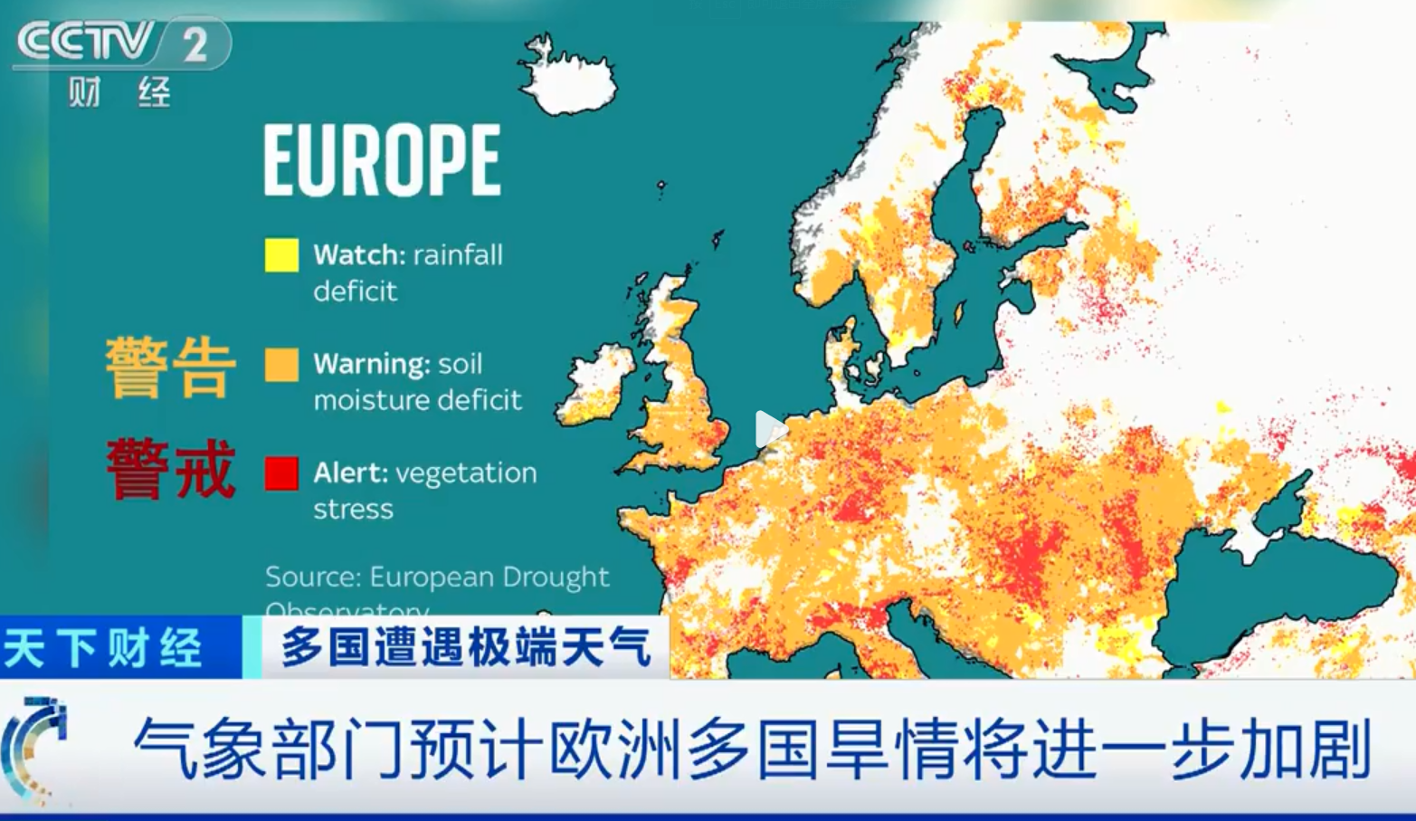 ▲据欧洲干旱观测网站的最新数据显示,在从7月21日到7月30日的10天里,欧洲约47%的地区处于干旱“警告”状态。而同一时间段内欧洲17%的地区已进入最为严重的干旱“警戒”状态,这意味着,正常的降雨已无法缓解土壤的干涸状况,植物和农作物的生长也都受到了影响。