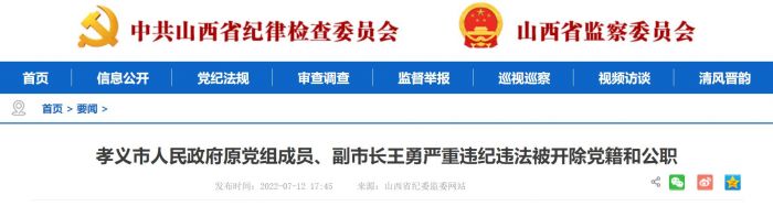 据山西省纪委监委网站7月12日消息,山西吕梁孝义市人民政府原党组成员、副市长王勇严重违纪违法被开除党籍和公职。