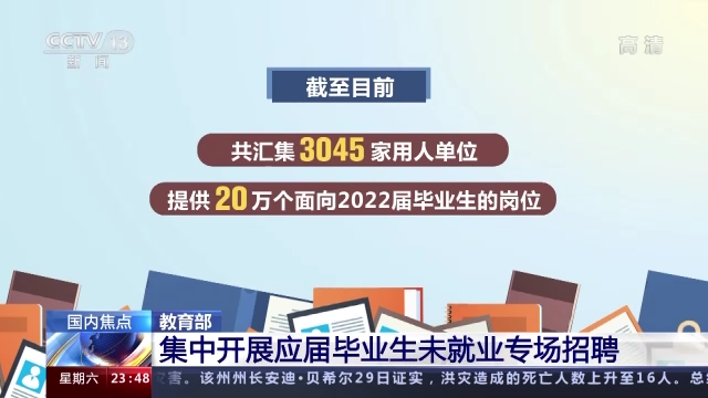 目前,教育部依托“国家大学生就业服务平台”集中开展“2022届高校毕业生离校未就业专场招聘活动”,截至目前,共汇集3045家用人单位,提供20万个面向2022届毕业生的岗位。