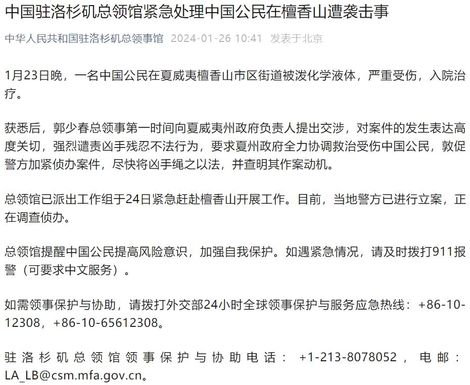 总领馆已派出工作组于24日紧急赶赴檀香山开展工作。目前,当地警方已进行立案,正在调查侦办。