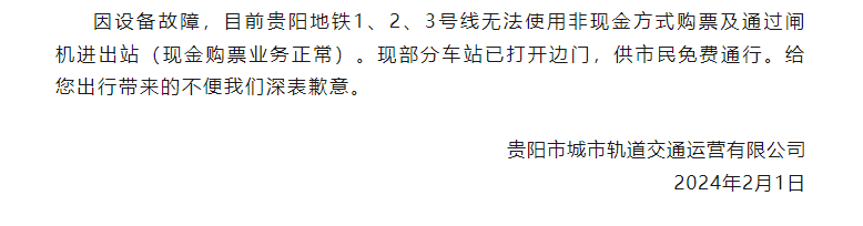 因设备故障,目前贵阳地铁1、2、3号线无法使用非现金方式购票及通过闸机进出站(现金购票业务正常)。现部分车站已打开边门,供市民免费通行。给您出行带来的不便我们深表歉意。