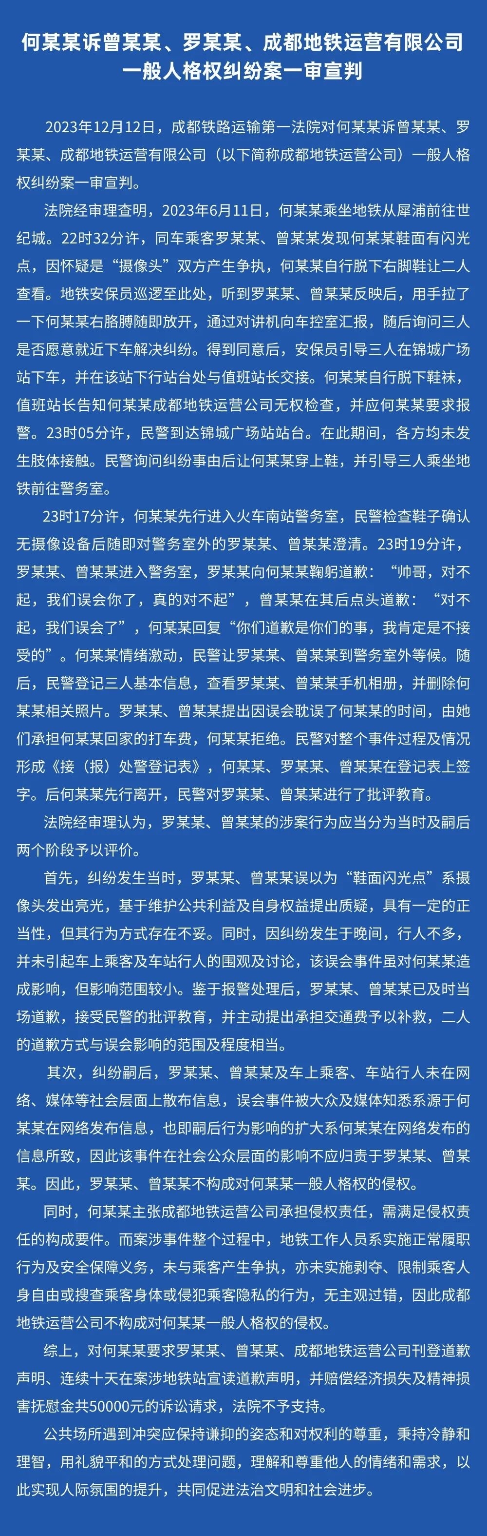 据成铁第一法院微信公号消息,12月12日,成都铁路运输第一法院对何某某诉曾某某、罗某某、成都地铁运营有限公司一般人格权纠纷案一审宣判。法院经审理认为,罗某某、曾某某的涉案行为应当分为当时及嗣后两个阶段予以评价。对何某某要求罗某某、曾某某、成都地铁运营公司刊登道歉声明、连续十天在案涉地铁站宣读道歉声明,并赔偿经济损失及精神损害抚慰金共50000元的诉讼请求,法院不予支持。