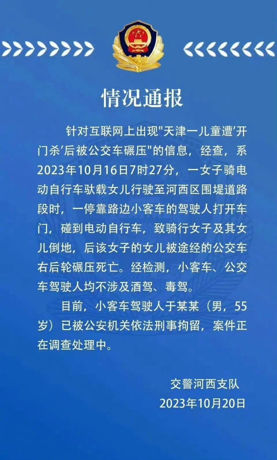 近日,“天津一儿童遭‘开门杀’后被公交车碾压”的消息引发热议,后“天津河西交警”官方账号发布情况通报进行回应。