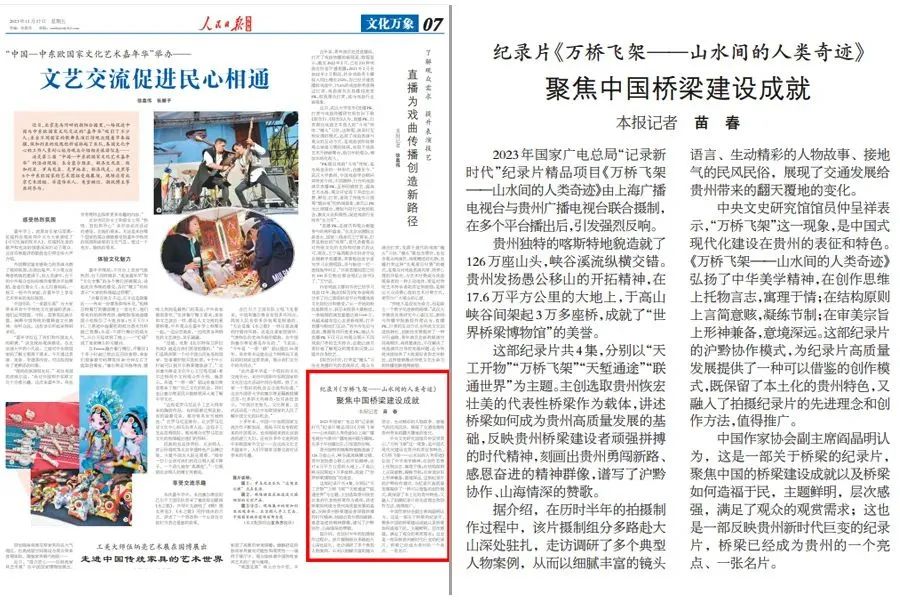 贵州卫视和上海文广集团联合制作的四集大型纪录片《万桥飞架——山水间的人类奇迹》,在多家卫视、多家重点视听平台以及广电联盟百家新媒体同步热播,多次得到中宣部、国家广电总局专题阅评和省委主要领导表扬;