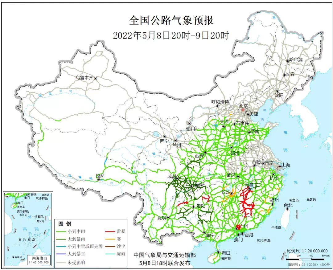 交通运输部发布全国公路气象预报:5月8日20时至9日20时,西北地区东部、西南地区东部、华北西部、江西北部、湖南南部、广西大部等地部分地区有中到大雨,其中,四川盆地中南部、重庆西南部、贵州西南部、广西西北部等地部分地区有暴雨或大暴雨。江西大部、广东中部、贵州西北部和东部等地局地有雷暴。另外,山西北部、浙江南部、福建中东部、江西西北部、湖南东北部、海南中部、陕西北部等地局地有雾。