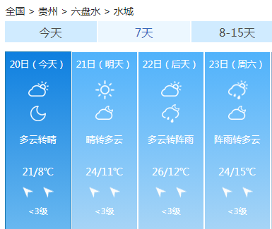 21日夜间到22日白天,多云有分散阵雨或雷雨;