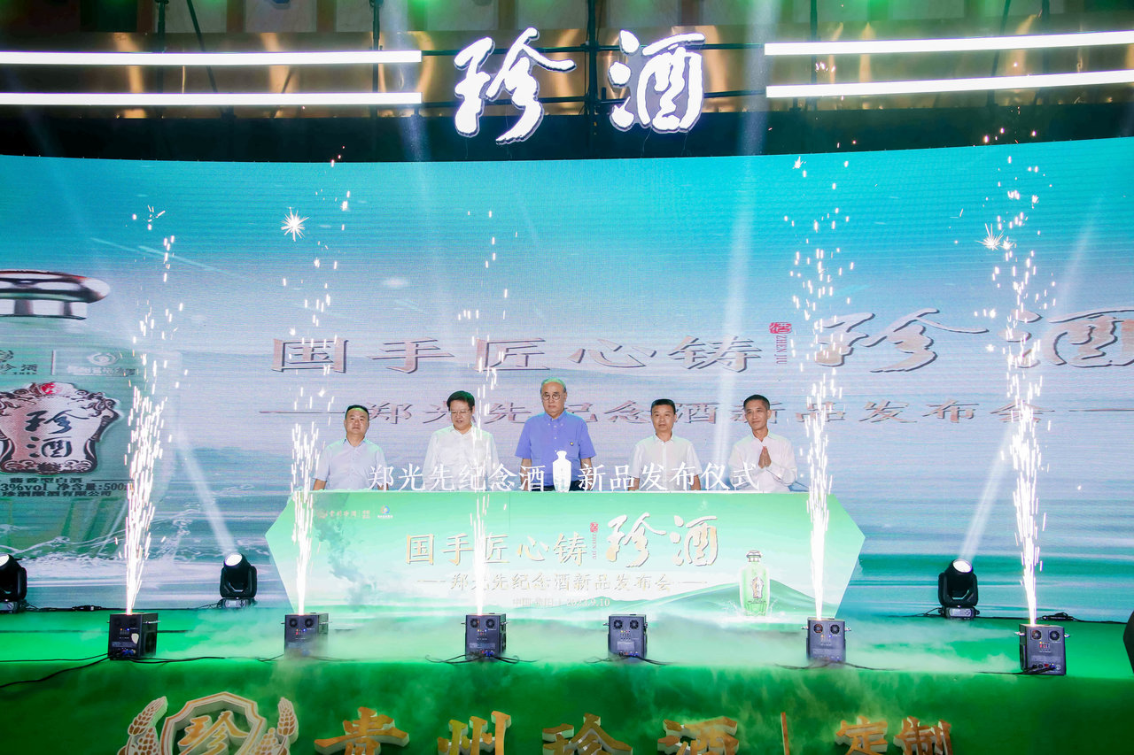 现场,中国酒类流通协会会长王新国,珍酒李渡集团董事长、贵州珍酒酿酒有限公司董事长吴向东、贵州郑公酒业集团董事长郑先强,贵州酱酒集团党委书记、董事长张涛、贵州酒文化研究会会长梁正五位嘉宾共同发布了“珍酒•郑光先纪念酒”。