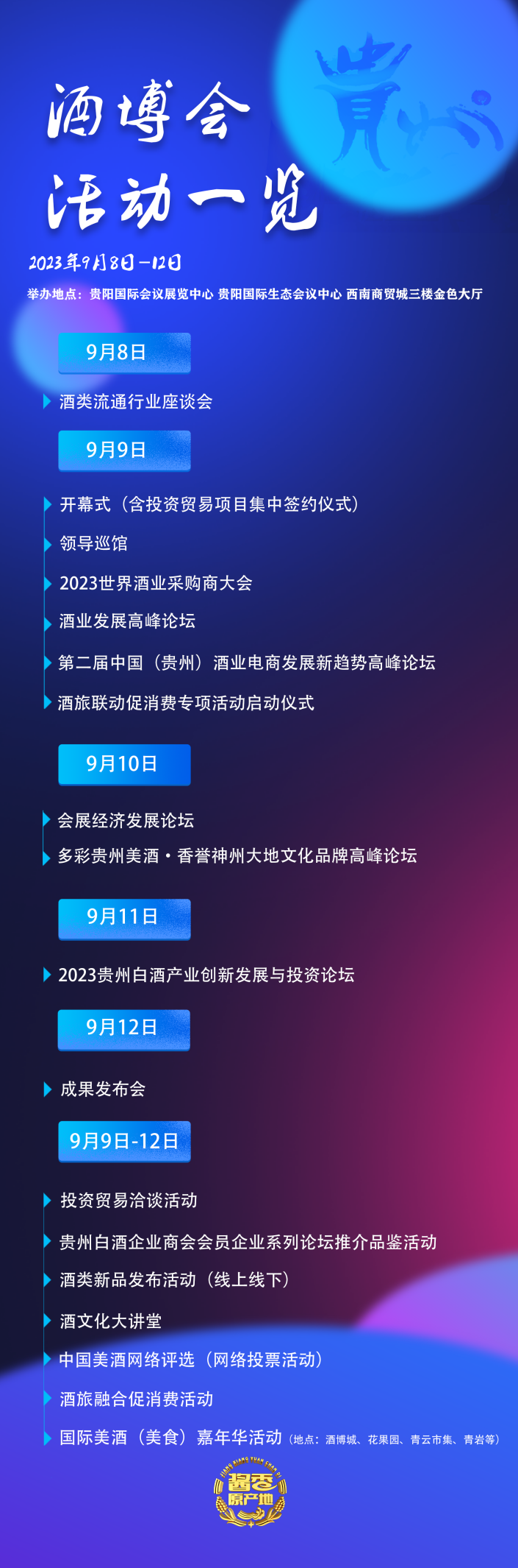 今天,第十二届中国(贵州)国际酒类博览会开幕!小编梳理了酒博会期间的主要日程活动,一起轻松参展,赶快下载保存吧!