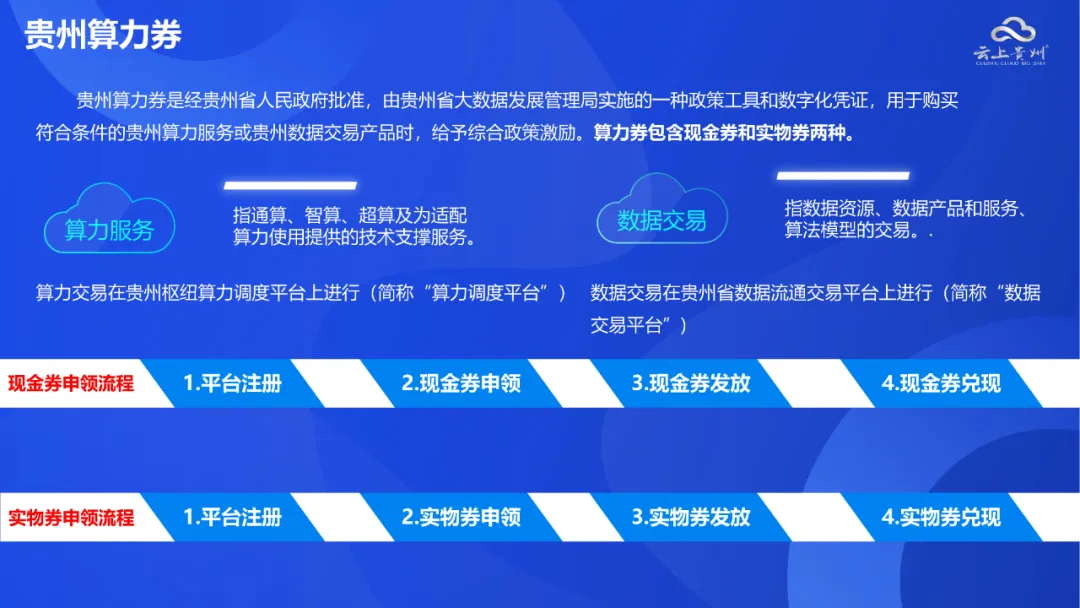 贵州算力券以需求侧为驱动,每年通过全国一体化算力网络国家(贵州)枢纽节点调度平台向符合条件的需求方发放总额不超过1亿元的现金券和若干实物券。旨在通过算力券政策激励,撬动算力产业发展活力,实现算力交易普惠化,促进企业用算赋智,赋能企业业务增长。