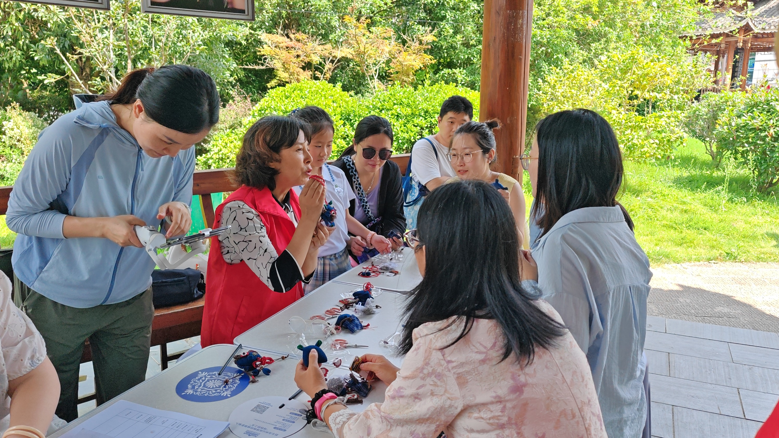 展板前,志愿之声赋温度:在《银装霓裳》服饰展前,志愿者小小讲解员涂熠晟以青涩且深情的讲述取代刻板介绍,解读苗族银饰上蝴蝶纹样背后的深意:“这是‘蝴蝶妈妈’创世传说的印记,姑娘出嫁时,一身的银饰更是家人沉甸甸的祝福。”这些源于志愿者深入民间、精心挖掘的“接地气”解读,让冰冷的展品焕发情感温度,生动诠释了传统文明的智慧与温情。在体验区,志愿者们热情化身“非遗导师”,耐心指导游客穿针引线学苗绣,巧手翻飞编绳结。“针尖这样走线,才能绣出苗家姑娘的灵气。”在志愿者的悉心传授下,零基础的参与者也能完成一件件带着手心温度的非遗小物,在指尖的实践中深刻体悟精益求精的工匠精神与文明传承的实感。