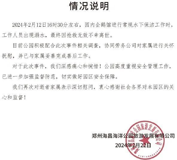 2月22日,郑州海昌海洋公园通报“工作人员溺水后离世”,全文如下: