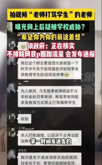 相关截图显示,有人对一名老师表示,“希望你能为你的前途着想”,并称:“你发布出去的那个视频,你以为对你有好处吗?校长今天跟你说的,你都没有听进去吗?不要盲目害了我们学校……你不用管那么多别人的事情,管好你自己的饭碗就行了,只要你把视频删掉,校长愿意今年帮你转正。”