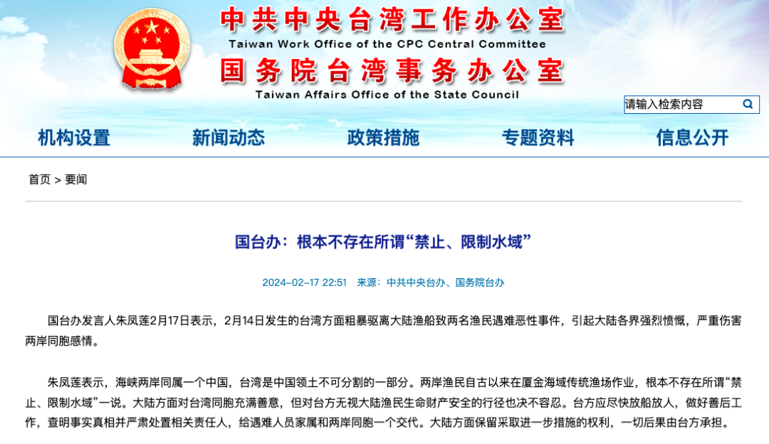 据国台办官网2月17日22时51分发布,国台办发言人朱凤莲表示,2月14日发生的台湾方面粗暴驱离大陆渔船致两名渔民遇难恶性事件,引起大陆各界强烈愤慨,严重伤害两岸同胞感情。
