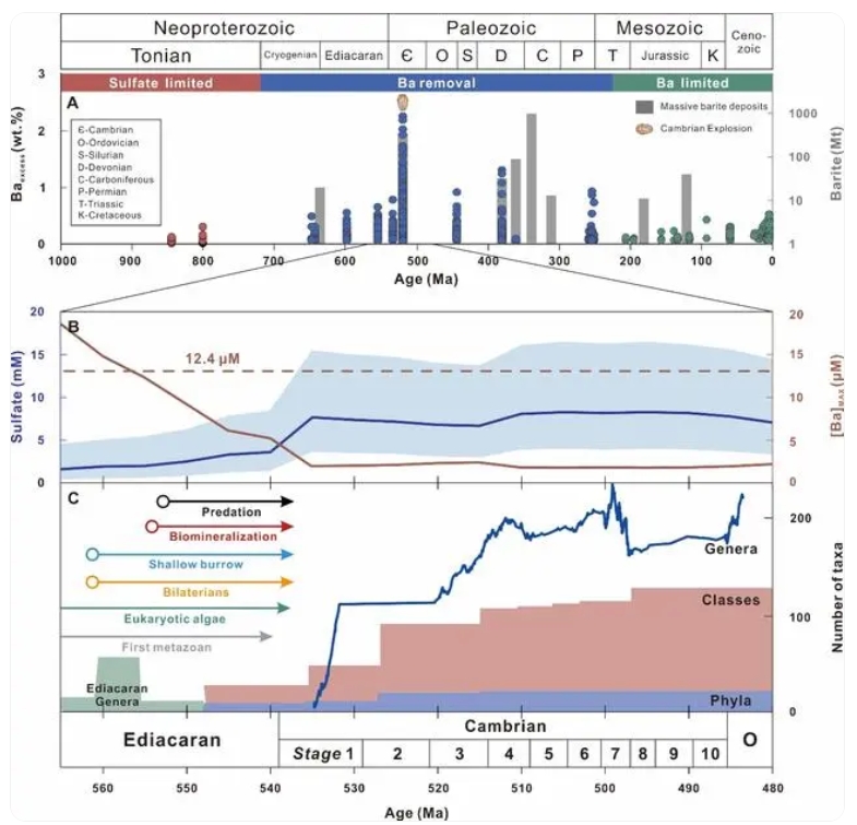 近期,卫炜等人通过扬子板块下寒武统富金属页岩的钡同位素数据发现,埃迪卡拉纪-寒武纪过渡时期海洋的逐渐氧化提升了硫酸根浓度,导致此前累积的溶解钡离子以重晶石形式被大量移除。水体中高浓度的钡会抑制水生动物的存活率,因此,对动物有毒害作用的硫化物和钡离子的移除,改善了海洋的宜居性,促使了寒武纪生命大爆发。