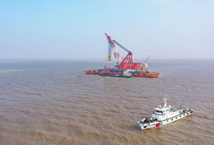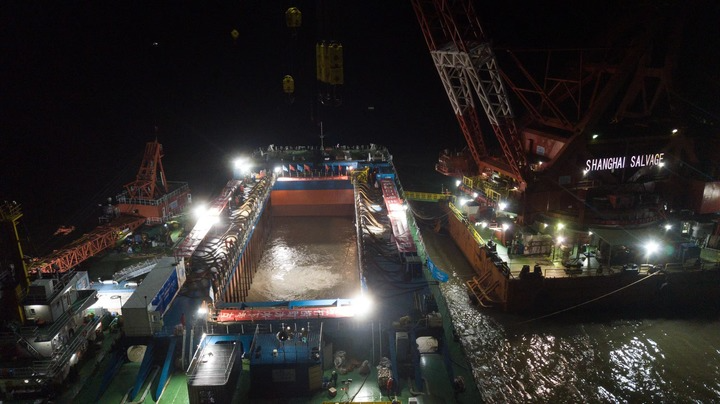 从20日夜间到21日凌晨,万吨“大力”号与我国自主研发的古船整体打捞专用工程船“奋力”轮携手,在长江口二号古船所在长江口横沙水域完成各项调试,启动智慧打捞监控系统,对这艘清代沉船实施水下整体打捞。